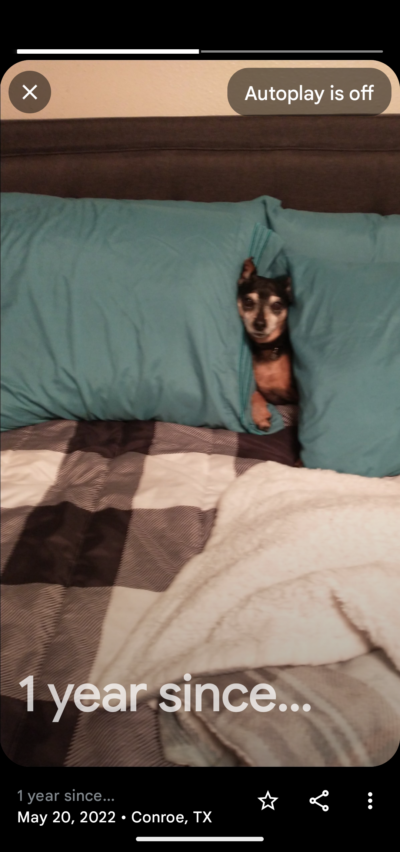 She loved her treats and she thought she could take on any bigger dog. She was my best friend. She will be missed.